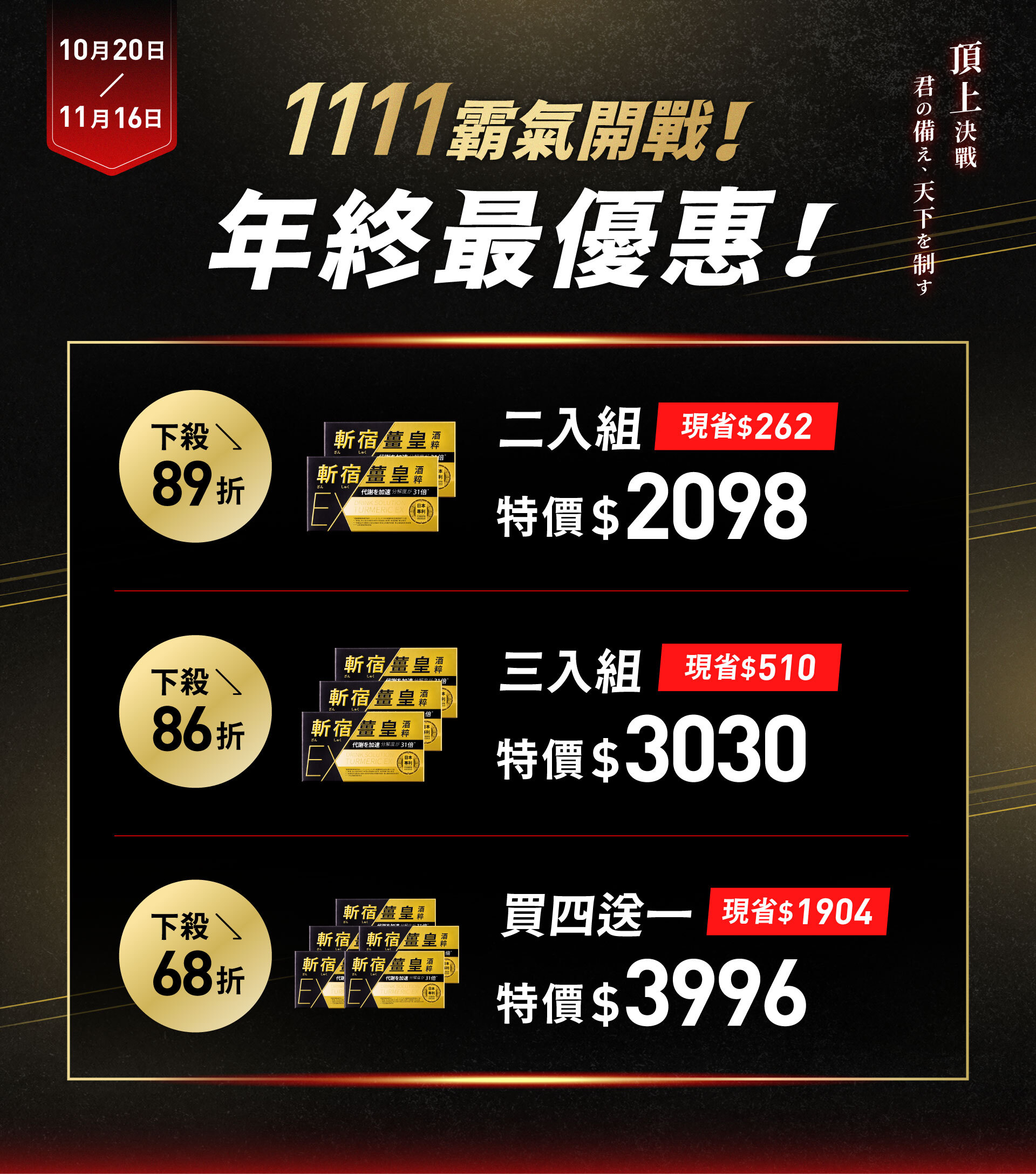 至2025-11-16T16:00:00.000+00:00截止 全店,【1111 霸氣開戰!】10/20-11/16 全館滿 $11,111 送 武倍對策 Gold 1 罐