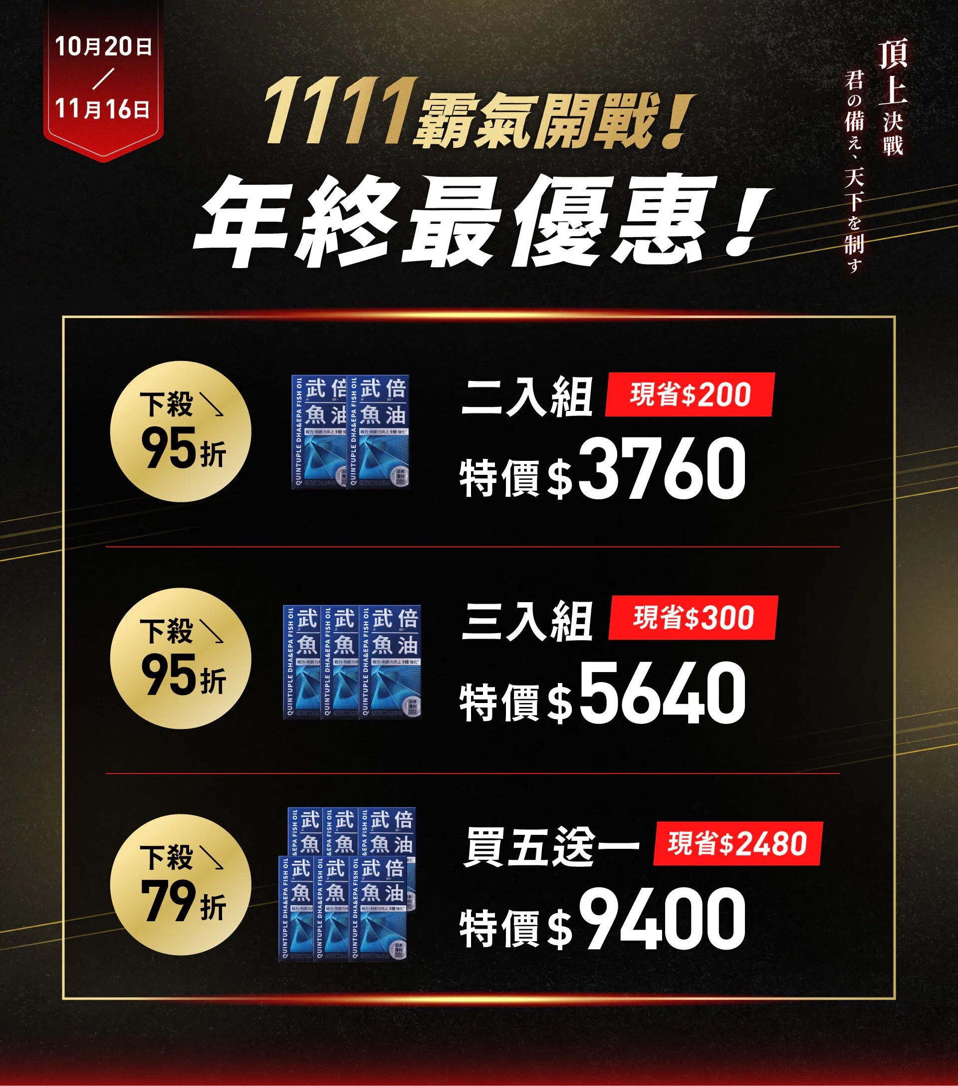 至2025-11-11T16:00:00.000+00:00截止 全店,【1111 霸氣開戰!】11/05 - 11/11 下單送武倍魚油 一日份