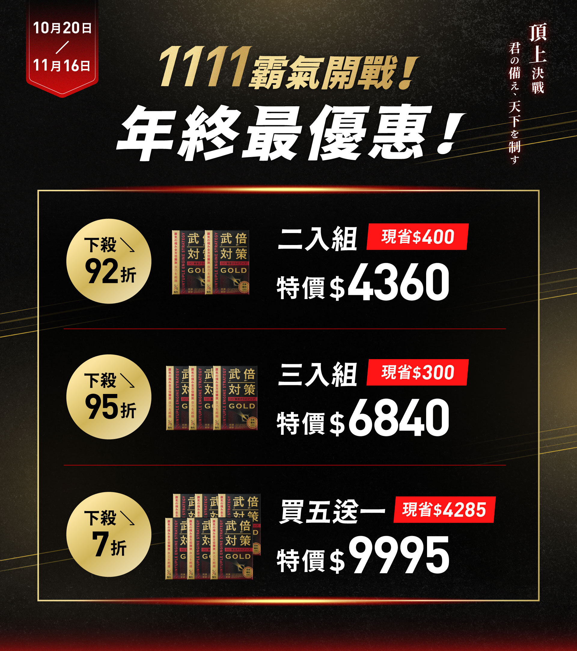 至2025-11-16T16:00:00.000+00:00截止 全店,【1111 霸氣開戰!】10/20-11/16 全館滿 $11,111 送 武倍對策 Gold 1 罐